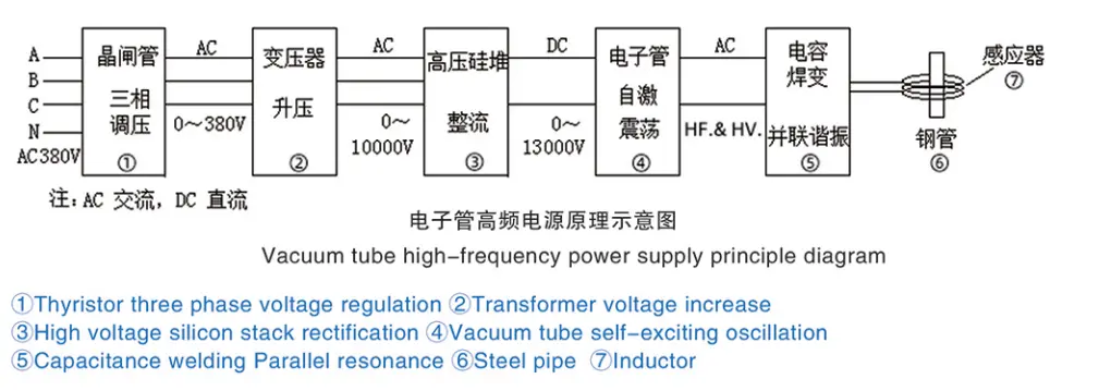 I-AC yesiqhelo yemizi-mveliso (inqanaba lesithathu leengcingo ezine 380V/50HZ eTshayina) iguqulwa ibe yi-AC ehlengahlengiswayo ukusuka ku-0 ukuya ku-380V (i-frequency ingatshintshwanga) nge-thyristor AC voltage regulator, emva koko inyuswe yaya kutsho phantse kwi-10000V amandla ombane aphezulu (i-frequency transformer engatshintshwanga, iphinde iguqule i-voltage nge-10 amawaka ombane ombane aphezulu e-DC, emva koko i-oscillation ngetyhubhu yevacuum ukuya kwi-HF kunye ne-HV yangoku, emva koko nge-LC parallel resonance ukukhulisa i-oscillating yangoku, nasemva konikezelo lokunciphisa umbane kwi-inductor esetyenziselwa ukufudumeza imibhobho yentsimbi kunye nezinye izinto zokusebenza njl.njl.